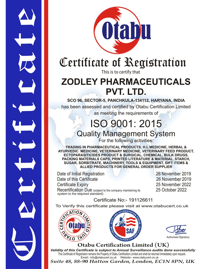 ZODLEY PHARMACEUTICALS PVT LTD ® (Zodley Pharma) is a marketing based pharmaceutical company with its main focus on making available quality pharmaceutical products at affordable costs to all. As one of the fast growing pharmaceutical company in India, Daksh's management mission is "dedicate always quality products at affordable costs". Our purpose is helping people live longer, healthier and happier lives.